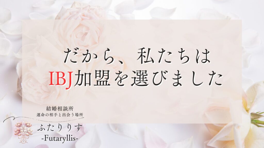 ふたりりす-Futaryllis-はIBJの正規加盟店です。私たちがこの仕事を始めるにあたり、なぜIBJに魅力を感じたのか、ここでそのことをお伝えしていきます。この記事を読み、IBJがどれだけ本気の出会いに満ちているのか、あなたにも知って頂ければと思います。...